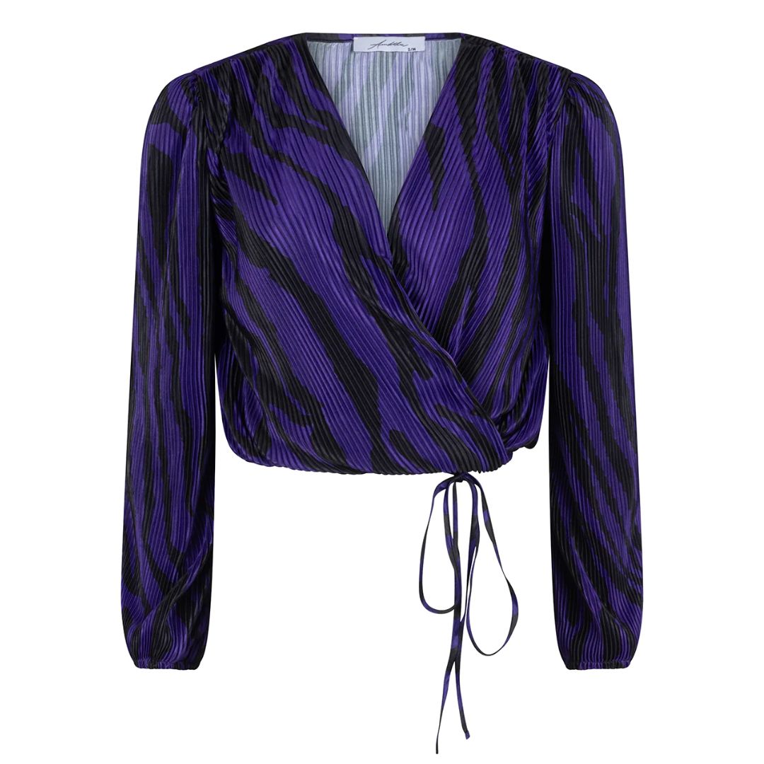 - De wikkeltop heeft lange mouwen en een strikcentuur.