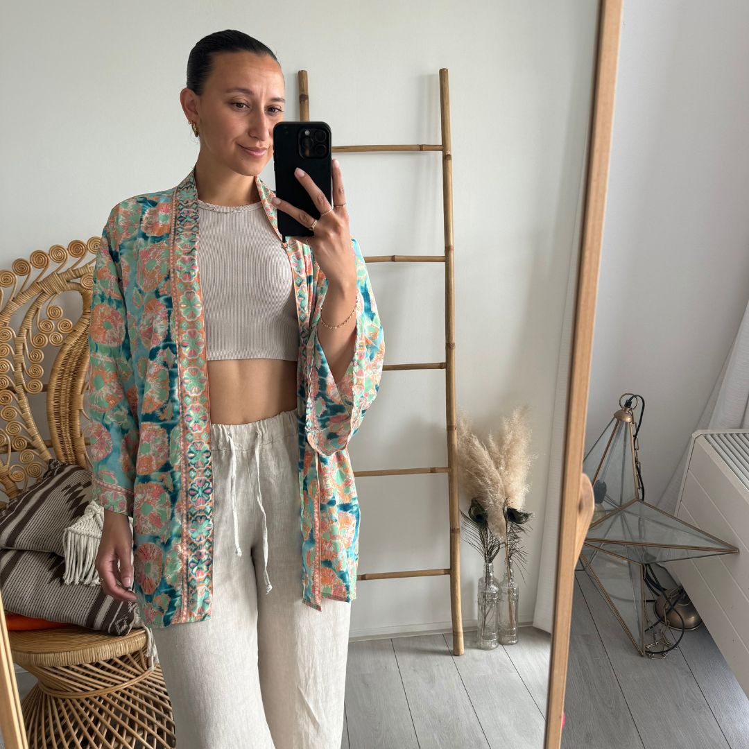 Deze luchtige bohemian kimono is de perfecte toevoeging aan je zomergarderobe. Gemaakt van een hoogwaardige mix van 70% zijde en 30% viscose, voelt hij heerlijk zacht en soepel aan op de huid. De kimono heeft een elegant vallend silhouet en wordt geleverd met een bijpassend lint, waarmee je de taille kunt accentueren. Draag ‘m open voor een nonchalante look of gestrikt voor een vrouwelijke touch. Ideaal als stijlvolle cover-up op het strand of als statement item op een zomerse dag. De kimono is verkrijgbaar in veel verschillende prints.