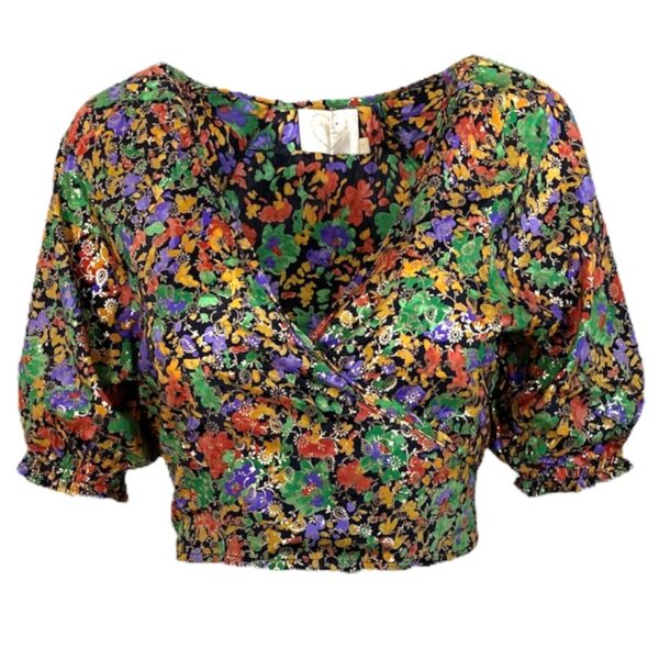 - De Luna Boho Wrap Top heeft een paisley print in de kleuren goud, zwart, geel, paars, rood en groen.