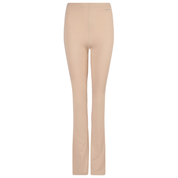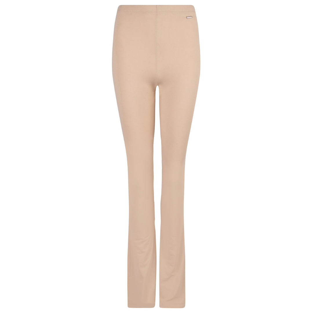 - De broek is high-waisted, heeft een elastische tailleband en bevat geen touwtjes.