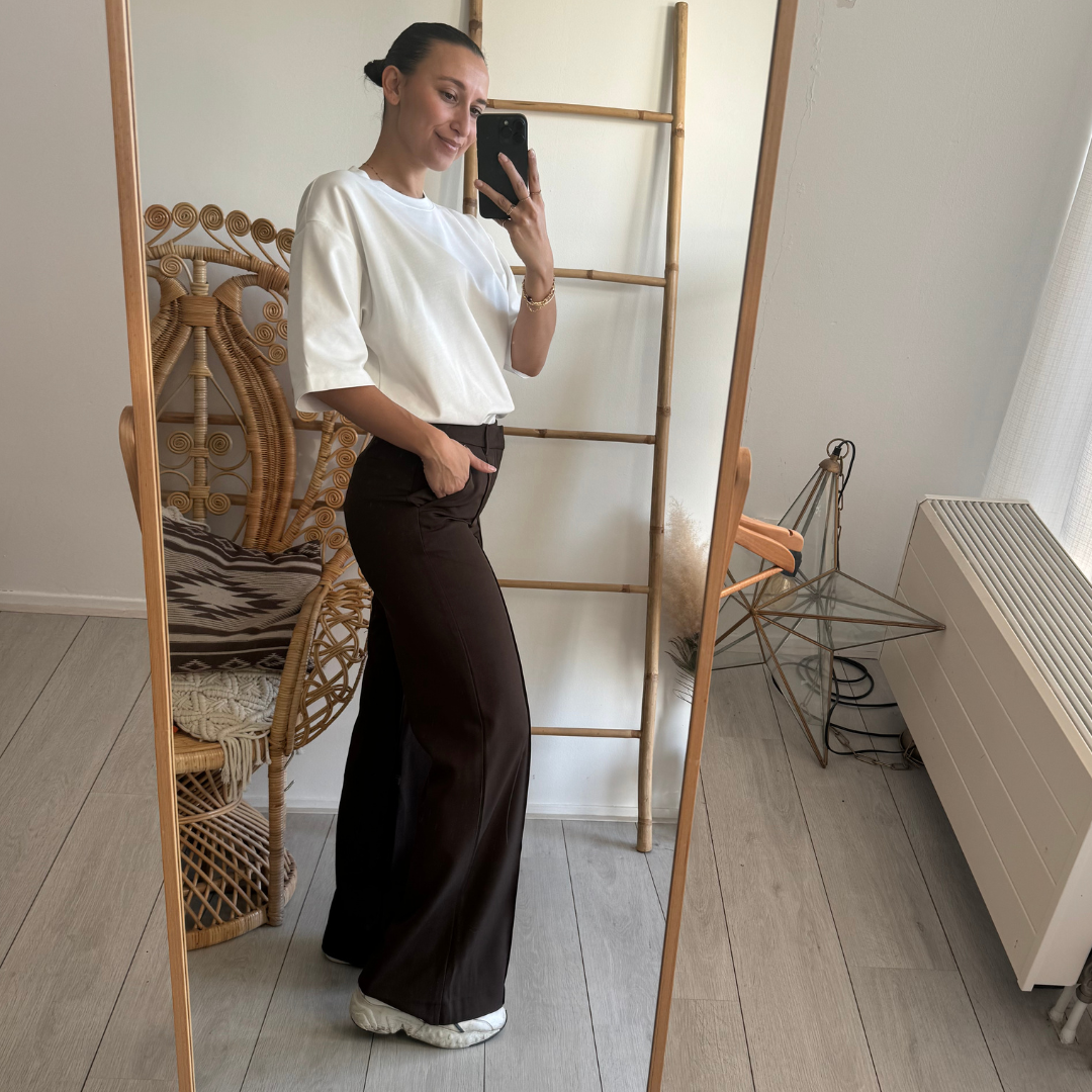 - De Jade Pants heeft rechte pijpen.