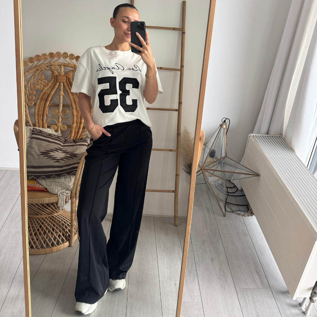 - De broek heeft een hoge taille.