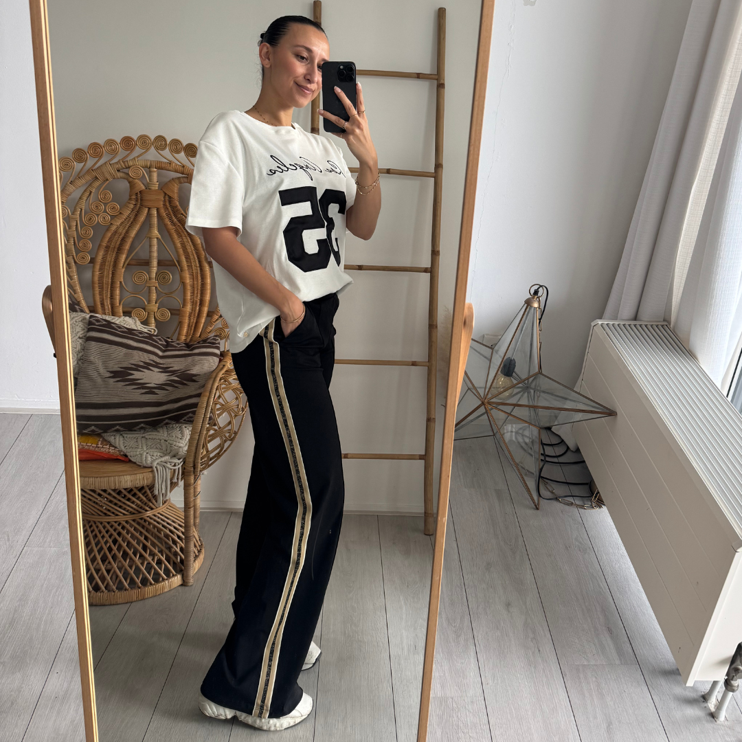 - De broek heeft een bies met een glitterdetail.