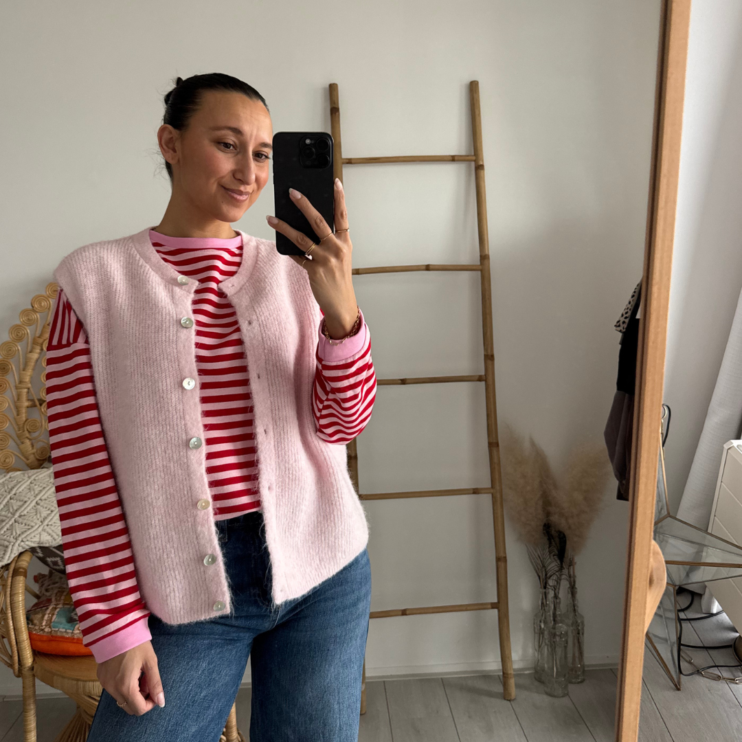 - Het gilet/ spencer is leuk te combineren met onze Pien Stripe Top of Sweater.